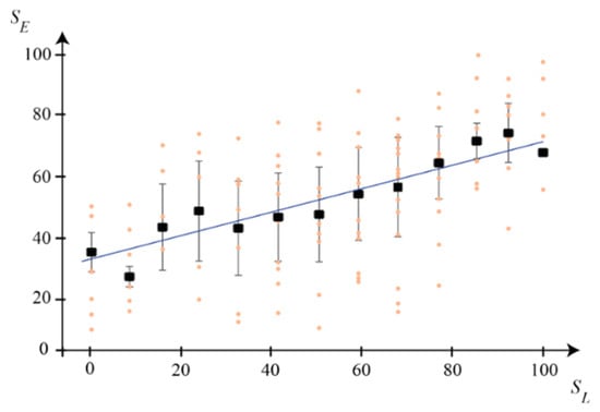 Figure 8 shows the dispersion of the total sample of students (engineering subset + science subset) in the plane . In this different representation, the score for the Lawson’s test is classified into 13 classes (12 pairs of items + 1 class corresponding to the score equal to zero), but it is represented again from 1 to 100 to facilitate the comparison with the other representations. For each score class, the vertically aligned dots represent the students that achieved such an score, which are distributed (vertically) according to the educational success scores achieved by each student. The black rectangles, instead, indicate the mean value (over the scores) of the fixed score class , and the corresponding black vertical bars indicate the respective deviations from that mean value.