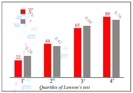 Correlation analysis performed separately for the different quartiles of the Lawson’s score (obtained by the total number of students). The numerical values given at each pair of columns indicate the average value of the Lawson’s score and the correlation coefficient calculated within the single quartile.