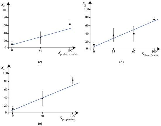 Figure 11 shows the five scatter plots versus the partial scores, which were obtained for the two upper Lawson’s quartiles of the total sample (the students of the engineering and science subsets). We avoided the representation points of the single clusters of students corresponding to a specific couple of values (i.e., the equivalent of the orange dots in Figure 8) because in this case, they would not provide any concrete information on the characteristics of the sample.