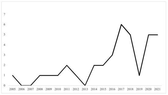 The evolution of publications contained in the last 15 years is presented in Figure 2. There is an upsurge of publications after 2012, with a peak in 2017. Despite a reduction in 2019, the number of publications increased again in 2020 and 2021, with five publications each year. Therefore, there has been increasing interest in the topic since 2012, with an uptrend movement for years ahead.