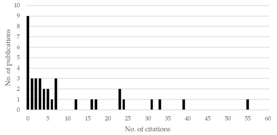 The analysis found that most papers have few citations, usually below ten, as seen in Figure 3. Publications, such as Hontvedt [1], Saus et al. [22], Sellberg [4], and Gekara et al. [23] are exceptions, receiving more than 30 citations each, with 55, 39, 33, and 31 citations, respectively. Thirteen publications have no citations, which may imply that they are not relevant or visible enough to be found.