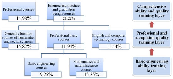 20]. However, the structure system emphasizes multidisciplinary cross-fertilization and the organization and design of the course contents are more complicated. Australia is a world leader in higher engineering education, and its curriculum structure is strictly designed according to the standards of Engineers Australia (EA), which requires engineering degree courses to be set up with engineering fundamentals (mathematics, physics, chemistry, principles, skills and tools of engineering) accounting for 40%, professional courses accounting for 20%, engineering design and project studies accounting for 20%, engineering practice accounting for 10%, and other elective studies accounting for 10% [