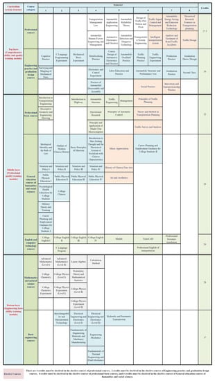 8]. It can be seen that the construction of the transportation major curriculum system in American countries is based on the civil engineering specialty, and the curriculum pays attention to basic knowledge. At the same time, it strengthens the study of methodology, mathematical modeling, data analysis and software application, and emphasizes the cultivation and exercise of students’ system analysis ability. In terms of curriculum system design, they paid attention to interdisciplinary intersection, cultivated compound talents, and built a creative and practical talent training mode of civil and traffic engineers by combining their advantageous discipline platform or professional teaching and practice resources.