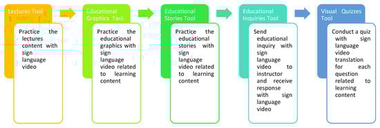 The proposed platform covers all learning content of deaf students’ courses. The primary users of this platform are deaf student instructors with an administrator mode and deaf students with a student mode in schools and universities. In the administrator mode, instructors can use nine graphical user interface tools of the proposed DLPDS and have full authority to administer the tools, as shown in Table 1 and Figure 1. The tools of the DLPDS are designed to facilitate adding learning content based on ready-made templates without the need for programing language skills from deaf student instructors. The deaf student mode provides the students with eight tools for displaying learning content and supporting good learning experiences for deaf students.