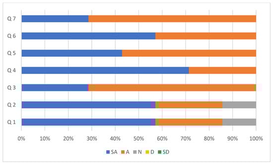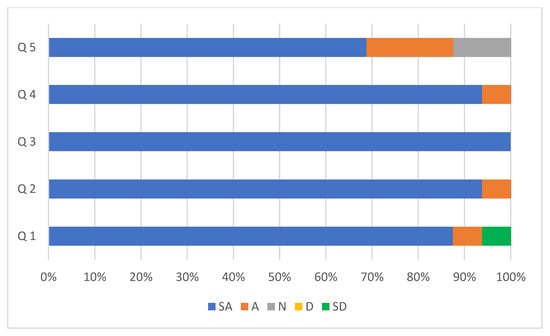 Table 4 and Figure 7 illustrate the deaf students’ perceptions regarding the proposed DLPDS. The mean score for question item Q1 was 4.69, indicating that deaf students agreed that the proposed DLPDS would be useful for learning the content of courses remotely. The participants confirmed that the DLPDS would help them learn better and provide several visual forms for learning content with sign language videos. This is evident from the mean for Q2 and Q4 of 4.94. They would like to learn all courses with this proposed platform (DLPDS). This is evident from the mean value for Q3 of 5. The participants concurred that the proposed platform is easy to use, as shown by the mean of Q5 of 4.56. Moreover, 100% of the participants had an utterly positive attitude (strongly agree and agree) regarding Q2 to Q4. Around 88% of the participants had a less positive attitude toward the easy-to-use nature of the platform in Q5. According to the questionnaire results, around 96% of all deaf students generally agreed that the proposed DLPDS is an acceptable distance learning tool, with the overall mean of 4.83.