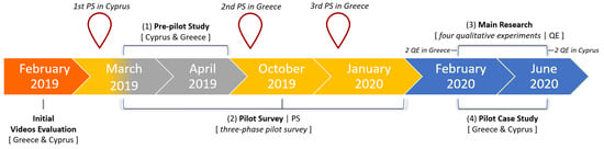The research design was quasi-experimental with four qualitative experiments constituting the main investigation. Likewise, a pre-pilot study and a three-phase pilot survey which were implemented prior to the main investigation were also included, as well as an independent pilot case study which was carried out concurrently with the main investigation. To summarize, this research design was not at all accidental because the research project MACE as original and innovative as mentioned above, also aimed to implement a method of development and research (also well-known as methodological development or even as multi-methodological approach) []. Therefore, to recap, the pre-pilot study was implemented aiming at evaluating the research protocol used before conducting the main investigation and the independent pilot case study. On the other hand, the implementation of the pilot survey was deemed necessary to determine whether it could be applied to a group of adult educators as part of a form of educational training / education for their professional development (i.e., in the main investigation)—a latent research aim of the pilot survey. Now regarding the independent pilot case study (pilot case study from here on), it should be mentioned that it was implemented for the first time both Greece and Cyprus, while, in general, this particular cross-cultural research study is perhaps the only one of its kind (i.e., during its planning and implementation, it was the only one—based on the systemic implementation that took place in the framework of the research project MACE). The most important reason for implementing and including this pilot case study is to further support the research results, effects, and findings from the main investigation to reach a comprehensive conclusion in this study. In order the potential readers and researchers to better understand this multi-methodological approach through the chronological implementation of the various research stages of the above research design, the research timeline was created in the form of a chart, presented as Figure 1. The research timeline was created through Microsoft PowerPoint 365® (version 18.2210.1203.0) and digital processing in Microsoft Paint (version 21H2), while it depicts the research stages such as (a) the Pre-pilot Study (1); (b) the three-phase pilot survey—Pilot Survey (PS) (2); (c) the Main Investigation—four qualitative experiments (QE) (3); and (d) the Pilot Case Study (4) (Figure 1). In addition, the research timeline includes the research stage of the initial evaluation of the new videos—something that will be discussed later (Figure 1).