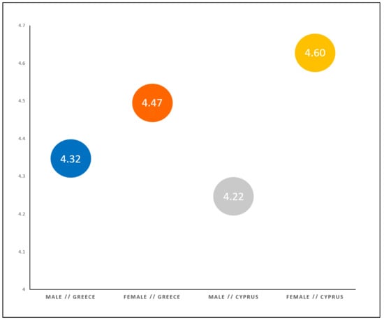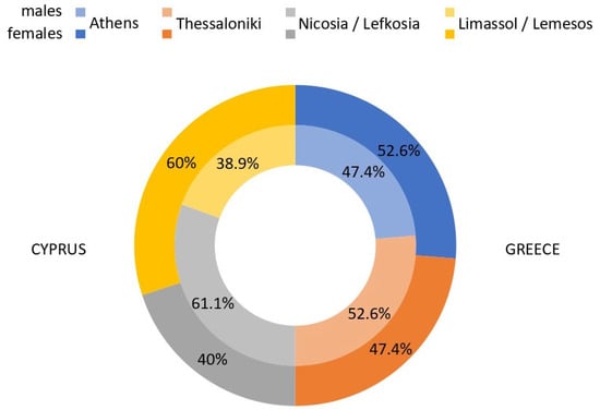 The statistical distribution of the variable of gender was 37 male adult educators with a percentage of 48.71% (i.e., 19 males in Greece with a percentage of 51.4% and 18 males in Cyprus with a percentage of 48.6%) and 39 female adult educators with a percentage of 51.29% (i.e., 19 females in Greece with a percentage of 48.7% and 20 females in Cyprus with a percentage of 51.3%) [] (p. 978). More detailed, (a) out of the 19 males from Greece nine were coming from Athens with a percentage of 47.4% and 10 from Thessaloniki with a percentage of 52.6%, and (b) out of the 18 males from Cyprus 11 were coming from Nicosia/Lefkosia with a percentage of 61.1% and seven from Limassol/Lemesos with a percentage of 38.9%, while (c) among the 19 females coming from Greece, 10 were from Athens with a percentage of 52.6% and nine from Thessaloniki with a percentage of 47.4%, and (d) out of the 20 females from Cyprus were eight from Nicosia/Lefkosia with a percentage of 40% and 12 from Limassol/Lemesos with a percentage of 60% [] (p. 978) (Figure 2).