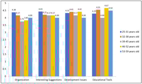 Regarding their age groups, the following research findings are obtained: (a) 21 adult educators 25–31 years with a percentage of 27.6% (specifically 11 males with a percentage of 14.46%—52.4% and 10 females with a percentage of 13.14%—46.6%) (i.e., GenZer and GenYer); (b) 29 adult educators 32–38 years with a percentage of 38.2% (specifically nine males with a percentage of 11.9%—31% and 20 females with a percentage of 26.3–69%) (i.e., GenYer); (c) 12 adult educators 39–45 years with a percentage of 15.8% (specifically six males with a percentage of 7.9–50% and six females with a percentage of 7.9–50%) (i.e., GenYer and GenXer); (d) 12 adult educators 46–52 years with a percentage of 15.8% (specifically nine males with a percentage of 11.85–75% and three females with a percentage of 3.95–25%) (i.e., GenXer); and finally (e) two adult educators 53–59 years with a percentage of 2.6% (specifically two males with a percentage of 2.6–100%) (i.e., GenXer and Baby Boomer Generation) [] (p. 978). More details on the adult educators’ demographics (age groups/generational cohorts and gender) are provided in Table 2.