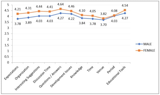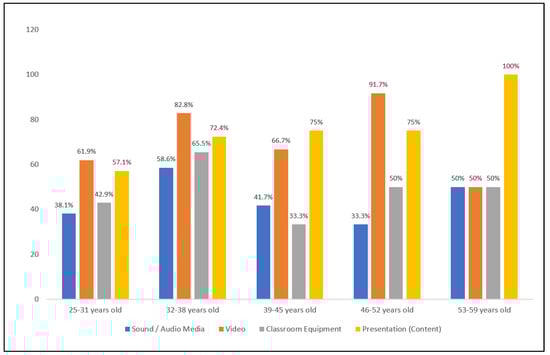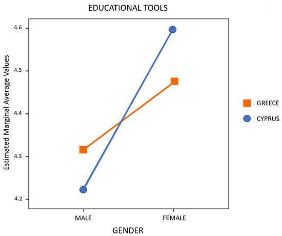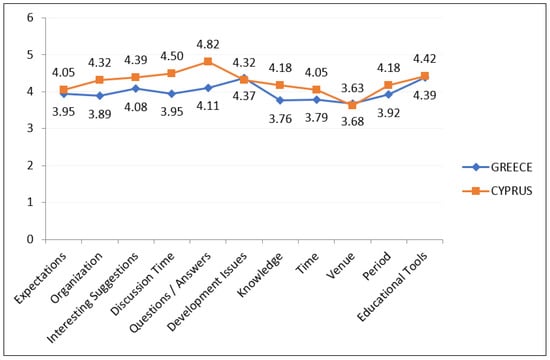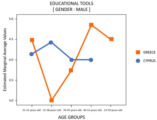 On the other hand, on the research data from the Evaluation Form regarding the averages value from four parameters associated with the “audiovisual-supported lesson plan”, the t-test for independent samples through SPSS was applied in relation to country of origin (i.e., Greece and Cyprus) and gender (i.e., male and female) of the research sample for the purpose of its validation or refutability. Additionally, the average value of the parameter for the “educational tools” used in the seminar was also re-analyzed using the following methods: (a) analysis of variance in two factors (i.e., two-way ANOVA—2X2) through SPSS in relation to country of origin and gender of the research sample; as well as (b) analysis of variance in three factors (i.e., three-way ANOVA—2X3) through SPSS in relation to the age groups (i.e., 25–31years old—GenZer and GenYer, 32–38 years old—GenYer, 39–45 years old—GenYer and GenXer, 46–52 years old—GenXer, and 53–59 years old—GenXer and Baby Boomer Generation), the country of origin, and the gender of the research sample. The research effects of the independent variables with respect to the analysis of variance are plotted in diagram forms (in this case as figures) through SPSS and digital processing in Microsoft Paint. Furthermore, to reveal and evaluate correlations with respect to the parameters or even with demographic research data of the main investigation, Pearson’s r correlation was performed through SPSS this time. More concretely, the demographic research data that could be used to correlate with the parameters was only the age groups. Eventually, the qualitative research data collected from the second section of the Evaluation Form were (a) re-grouped and re-adjusted as quantitative research data in the form of four keywords (i.e., sound/audio media, video, classroom equipment, and content of seminar presentation; presentation) through research data segmentation and hermeneutical coding [,]; and (b) re-presented in graph form (i.e., again as figures) through Microsoft Excel 365® (version 18.2210.1203.0) and digital processing in Microsoft Paint (version 21H2), for better comprehension []. Finally, the research data from the FSS tool on the one hand were re-analyzed and re-presented based on the proposed scale score in the literature through Microsoft Excel 365® as well.