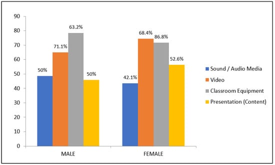- The first section consisted of 11 parameter questions (hereinafter referred to as parameter/s) in quantitative format with a five-point Likert scale based on the degree of satisfaction of quality (1 = ‘VERY POOR’ to 5 = ‘EXCELLENT’) [] (p. 975). In order to better present the research data and interpret the research results, effects and findings [] of this study from the re-analysis, the parameters were presented into three parts. Notably, in the first two parts the parameters were divided, while in the third part only the parameters associated with the “audiovisual-supported lesson plan” were included for the purpose of its validation or refutability. The first part included seven parameters based on the “organization of acquired knowledge” in relation to the “expectations”, the “organization”, the “interesting suggestions”, the “discussion time”, the “development issues” (if they were interesting), the “questions/answers” at the end of the seminar, and the “knowledge” acquired (i.e., the theoretical background investigation). Subsequently, the second part included four parameters based on the “spatial technical/logistical infrastructure” in relation to the “time” (i.e., the time conducted), the “venue”, the “period” (when it took place), and the “educational tools” (i.e., the ICT-tools) which were used in the seminar. Finally, the third part included four parameters associated with the “audiovisual-supported lesson plan”, which are the “organization”, the “interesting suggestions”, the “development issues” (if they were interesting), and the “educational tools” (i.e., the ICT-tools) which were used in the seminar;