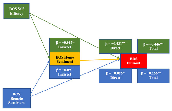 In the BOS mediation analysis, self-efficacy and remote learning sentiment are independent variables, home environment sentiment is the mediating variable, and burnout is the dependent variable (Figure 1). The results show that the direct effects of remote learning sentiment on burnout produced a slight negative correlation ( β = −0.076 ns). The indirect effect between remote learning sentiment and burnout mediated by home environment sentiment ( β = −0.09 **) again shows a slight negative correlation. The total effect of remote learning sentiment on burnout is ( β = −0.166 **) indicating a moderate, negative correlation. These data tell us that a higher remote sentiment can moderately lessen burnout effects thus lending support to Hypothesis 1. Please refer to SM15 for the complete BOS and EOS mediation models.