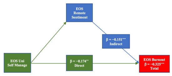 In the EOS mediation analysis, university self-management is the independent variable, remote learning sentiment is the mediating variable, and burnout is the dependent variable (Table 8 and Figure 2). The results show the direct effects of university self-management on burnout produced a moderate, negative correlation ( β = −0.174 **). The indirect effect between university self-management mediated by remote learning sentiment shows a moderate, negative correlation ( β = −0.151 **). The total effect of university self-management on burnout is ( β = −0.325 ***) indicating a moderate, negative correlation. These data show that both the direct and indirect effects of university self-management on burnout are moderately, negatively correlated. The total effects, however, do indicate that university self-management is fairly broad as it has direct burnout effects and indirect burnout effects mediated by remote learning sentiment.