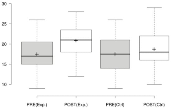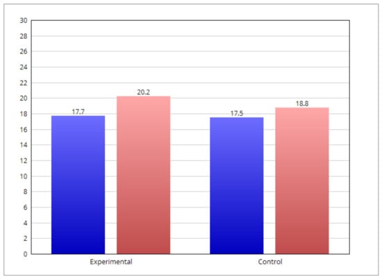 The results show that in both the experimental and control groups there was an improvement in the score obtained in the final test compared with the initial one, although that of the experimental group was more significant. It is understood that the group used as the control group will always show some improvement simply by taking the test a second time, as the participants have the chance to ask themselves again about some doubts they may have had when taking the test and improve some of their answers. The average difference between the initial and final test for the control group was 1.3, while for the experimental group, it was 2.5, so the practical intervention clearly had a significant effect on the development of the skills analysed with this test. The data of the experimental group obtained in the pre-test and post-test have a standard deviation of 3.7 and 3.9 points, respectively, while the data of the control group obtained in both tests have a standard deviation of 4.2 and 4.4 points each.