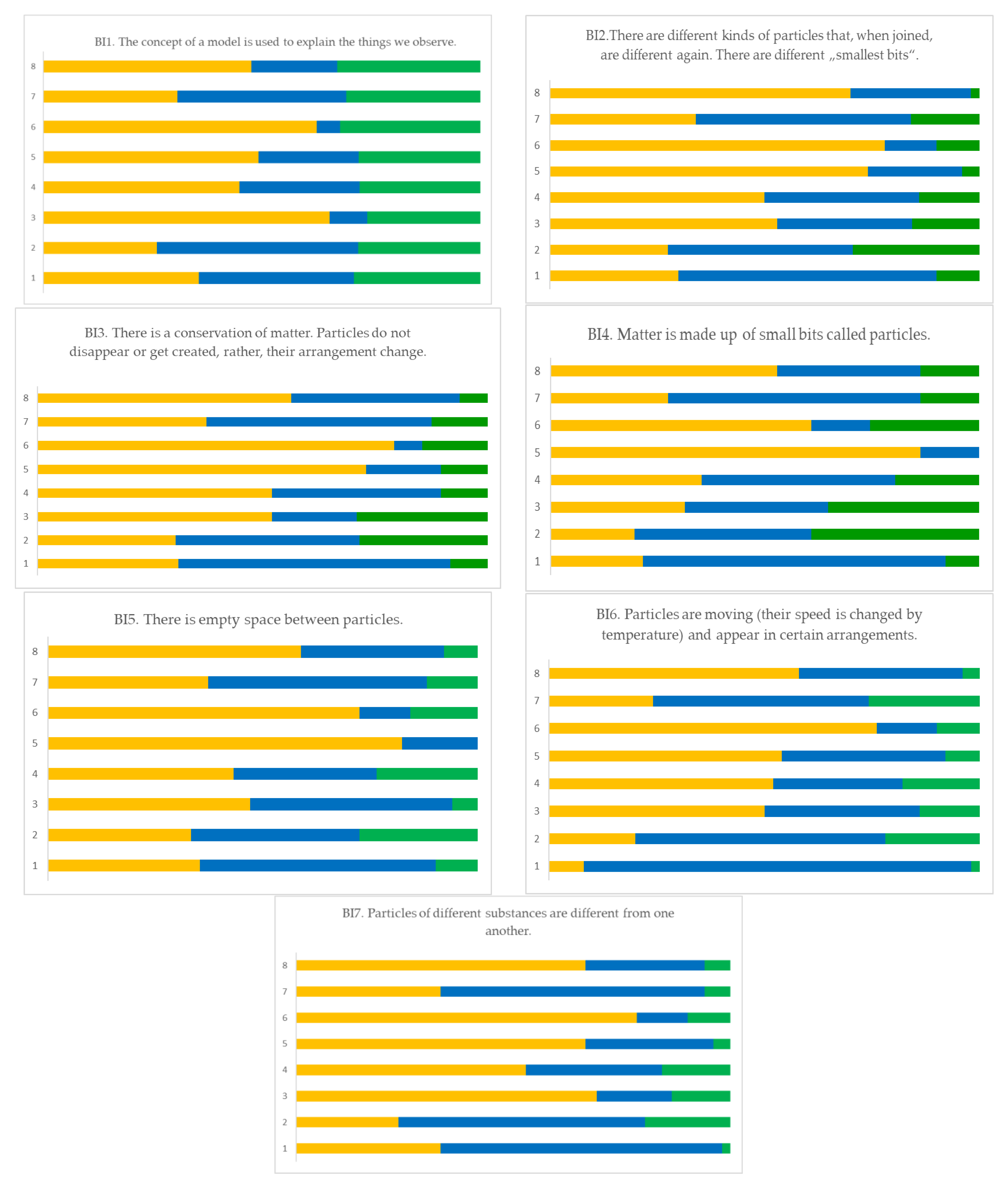 Wider personal knowledge (q3) is mostly at the novice level for all Big Ideas, except BI4 (advanced) and BI5, where there is an equal distribution between novice and intermediate levels. The novice level of knowledge is shown for difficulties/limitations connected with teaching (q4) for all the ideas except BI4 (intermediate level). Here, the number of participants expressing their knowledge at the intermediate level is the highest. Question 7 about the teaching procedures represents the knowledge about the instructional strategies, and it is at the intermediate level for all the Big Ideas (“… I will do some experiments with them and they will have to take notes and draw the experiment…; With demonstrated experiment and then we will see the video about particles in the experiment… ”). The advanced level is the least represented in this question. The exceptions are BI1 and BI6, with an equal distribution between the advanced and novice levels of knowledge. Knowledge of the assessment, questioned by question 8, about the specific ways of ascertaining students’ (mis)understanding of these ideas is mostly at the novice level. The intermediate level of knowledge is more represented than the advanced one, except for the first Big Idea.