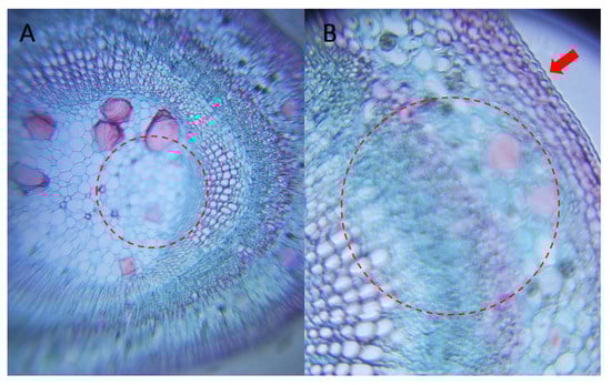 Unfortunately, there were few students who shared their own photographs. Besides, they did not have access to tissues processed by an expert; therefore, most of their photographs could not validate the actual resolution of the microscope. To do that, some micrographs of expert-processed tissue were taken. The plant structures selected were Tilia sp. in three different developmental stages: (1) meristematic stem (a plant tissue consisting of undifferentiated cells; Figure 4), (2) 1 year stem (Figure 5) and (3) 2 years stem.