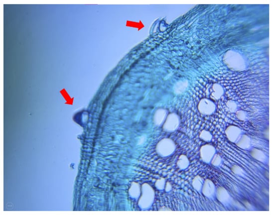 Cross section of Cannabis sativa. Red arrows mark trichomes, an outgrowth of the epidermis where the cannabinoids are stored.