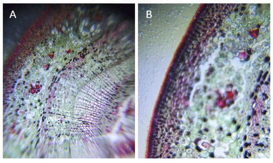 Finally, apart from Tilia samples, various photographs of Cannabis sativa. stem were taken as well (Figure 5). Again, the Foldscope allowed the visualization of specific structures, such as the characteristic trichomes of Cannabis sativa.
