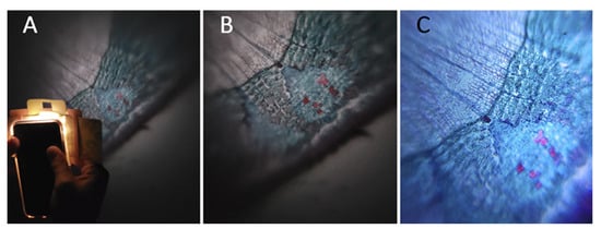The need for usable microscopes under a wide variety of circumstances led to the creation of the Foldscope (Figure 2) at a Stanford University (California) laboratory. This “origami microscope” simplifies all the parts of a conventional microscope, which allows it to be affordable and accessible outside of hospitals and research centers [11,12,18]. The Foldscope was first presented in 2014, and its use in biomedical sciences has become so popular that nowadays, more than 1 million Foldscopes have been sold. The cost of the materials is estimated to be less than one dollar and it can be assembled in 10 min. Conventional microscopes use a light bulb to illuminate the sample; therefore, they need a power supply. The Foldscope does not need to be plugged in because it includes an LED and a small battery [15,19]. To view the sample, the Foldscope must be held with both hands and placed close to the eye until the eyebrow touches the paper. To focus the image, a piece of the Foldscope can be moved with the thumbs to change the Z axis [20]. Moreover, a mobile phone camera can be attached to the Foldscope to take pictures of the samples.