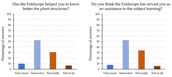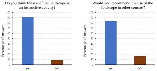 The students’ opinions were far better according to the dichotomic questions, as 90% of the students thought that the Foldscope project was an instructive activity. In addition, more than 80% of the students would recommend the use of the Foldscope in other courses (Figure 9). With all these data, it is obvious that whilst the use of the Foldscope in this educational scenario has room for improvement, the students are in favour of using the Foldscope in the project subject and others. It is obvious that using innovative tools can promote the teaching and learning process [22,23].