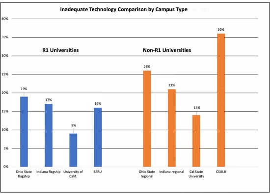 This study was prompted by research suggesting that data differ by types of institutions. For example, Galanek et al. found that undergraduates at masters-level and doctorate-level private universities were less likely to report good or excellent overall technology experiences [47], whereas recently, Jaggars et al. found more inadequate technology at non-R1 campuses than at R1 institutions [42]. Meanwhile, Buzzetto-Hollywood et al. reported lower device access at historically Black universities [58]. Although we could find no pre-pandemic research on technology adequacy at Hispanic-Serving Institutions (HSI), substantial numbers of students in two recent studies in California, which has a large number of HSIs, reported technology challenges [49,50].