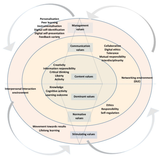 The Russian educational standard for higher education (particularly, pedagogical education) comprises universal competencies and their categories in the context of future professional activities in the digital economy society, including systemic and critical thinking; intercultural interaction and communication; teamwork and leadership; self-organisation and self-development; and life safety [33]. In terms of DLE, ethical and responsible behavior in the digital environment is especially important. Thus, the list of important professional values of a teacher in the context of digitalisation includes teamwork (cooperation), leadership, self-development, openness to novelty, social activity (caring for others), systemic and critical thinking (competent implementation of information processes), and tolerance (intercultural and social).