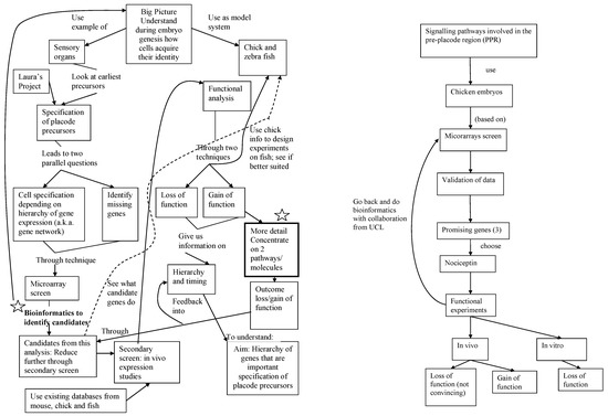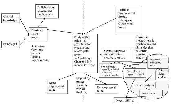 The first set of maps (see Figure 2) covers the topic of the PhD, from supervisor and student Pair A, in biological sciences. As the map on the left shows, the supervisor has a much broader conception of the PhD, focusing more on the process rather than the end-product [73]. The supervisor map places the student’s project in the wider research area and details numerous experiments and techniques to explore the topic. The student map, on the right, shows a much more linear, and functional, conception of the PhD.