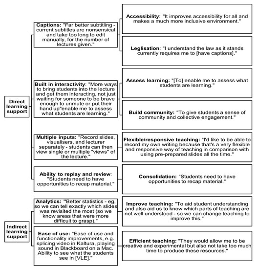 Staff identified several features of LC that would be useful to directly support learning including captioning, interactivity, multiple inputs and the function of replaying. They also noted functions that would indirectly support better learning including analytics and an easy to use interface that would allow simply and quick editing. As might be expected, given the emphasis on active learning in previous responses, the rationale for these centred on active, student-centred learning that allowed staff to assess student learning to improve teaching and provide an inclusive, accessible resource. Prior to the pandemic the rationale behind capture was rarely stated but inclusivity was seen as a key driver [48,49,50]. Additionally, the functions noted by staff here have some precedent in research. For example, the replay feature is commonly used by students [51,52,53,54]. The use of captioning, whilst newer, is also gaining importance. This is partly driven by recent legislation about accessibility of websites, including LC videos on VLEs in the UK and Europe [55] but also by theoretical approaches, such as the Cognitive Theory of Multimedia Learning (Mayer, 2014). This theory assumes that (i) people have separate channels for processing visual and verbal information, (ii) people have a limited capacity in working memory for each of these channels, and (iii) we must actively process information for meaningful to learning to occur. The theory proposes that captioned lectures (whether live or pre-recorded) can provide a dual-channel approach to processing, with the spoken word (verbal) and caption (visual) operating together.