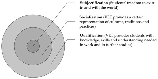 In this study, we based our reflections on Biesta’s view [8,9] of education’s domains and argued that it should be considered as a composite question that should specify its views about qualification, socialization, and subjectification. Biesta [9] proposes that domains of education could be represented as concentric circles with subjectification either as the inner or outer of the circles. In the study, we have positioned subjectification at the center because subjects, students and their experiences compose the core of our research (see Figure 1). However, this does not mean that we disregard vocational qualification, knowledge, skills, and traditions, but we believe that in the domain of education, we are always connected to the practices that are pursued and transformed together with the students [9,29,35,36]. Hence, to understand the world, to construct new ways of doing things, to connect people in new social and political orders necessitates the transformation of practices that exist in intersubjective spaces in society [29,35,36]. Without a strong connection to the subject and subjectification, vocational qualification becomes training which is something we do to others, not with them [9] (p. 102).