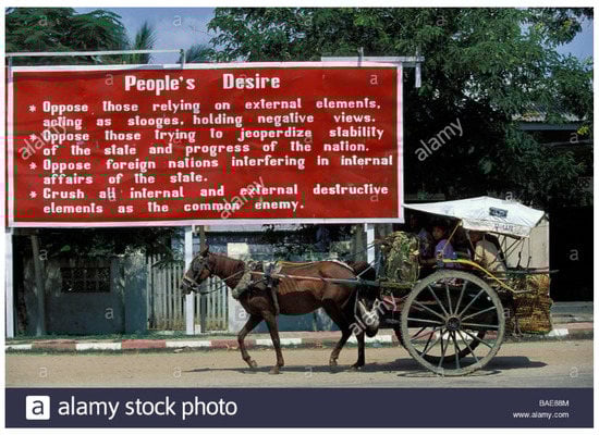 Key to the understanding of Myanmar nationalism and a Myanmar identity pushed by the Tatmadaw is the unity of the nation. Throughout its control of Myanmar since 1962, the Tatmadaw has portrayed itself as the saviour of the nation, the defender of the Buddhist religion and guardian from Westernisation. The 1962 coup leader Ne Win, who inaugurated the history of military dictatorships, clung to the values of nationalism and social redemption based on anti-colonialism against the English and Japanese. The idea of the army as the backbone of the country was born in those years: its men belong to the Bamar ethnic group—the predominant one in Myanmar—they are Buddhists and consider themselves the guardians of the homeland []. Its definition of nationalism is prevalent in its infamous propaganda lines visible on the signboards across Myanmar in Figure 1: “Tatmadaw is the father, Tatmadaw is the mother,” “Oppose those relying on external elements, acting as stooges, holding negative views”, “Oppose foreign nations, interfering in internal affairs of the state.”