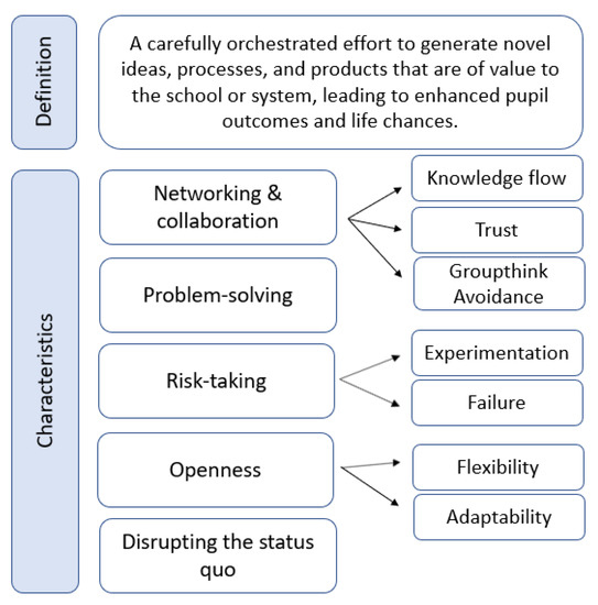 To meet today’s societal and educational demands, there is a need for Cr&Inn to become the modus operandi for schools to prosper [16]. Yet, tension arises through the need to balance Cr&Inn with accountability [2,3], particularly when considering the high stakes of school improvement and learner outcomes. Tyagi et al. [17] highlight this tension foremost because Cr&Inn is often viewed as risky, yet they conclude that creative individuals are more likely to take social risks, where they are willing to ‘challenge the norms’ (p. 2), rather than in domains related to ethics, health and safety, and financial. Drawing from the broader literature, many definitions for Cr&Inn centre on novelty and value [18]. Additionally, Stoll and Temperley [19] signpost commonly associated characteristics such as risk-taking; experimentation; problem-solving; and collaboration.