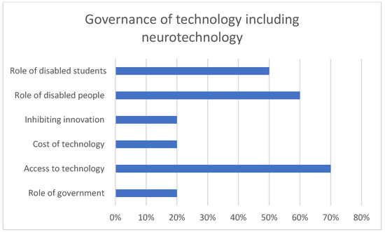 We structured the results section into five sections: (a) demographics (Section 3.1), (b) views on and involvement in knowledge production (Section 3.2 with Section 3.2.1 Understanding of Knowledge Producer Identity, Section 3.2.2 Involvement in Knowledge Production, Section 3.2.3 Barriers to Knowledge Production, and Section 3.2.4 Factors that Entice Disabled Students to be Involved in Knowledge Production), (c) general views and perception of technology including neurotechnology (Section 3.3 with Section 3.3.1 Views and perception of Technology, Section 3.3.2 Views and perception of neurotechnology), (d) ethical, social, legal, and economic implications of technology including neurotechnology (Section 3.4 with a separation into Section 3.4.1 Ethical, Section 3.4.2 Social, Section 3.4.3 Legal, and Section 3.4.4 Economic), and (e) governance of technology including neurotechnology and governance of knowledge production (Section 3.5 with Section 3.5.1 Governance of Technology including Neurotechnology and Section 3.5.2 Intersection of Knowledge Production and Governance).