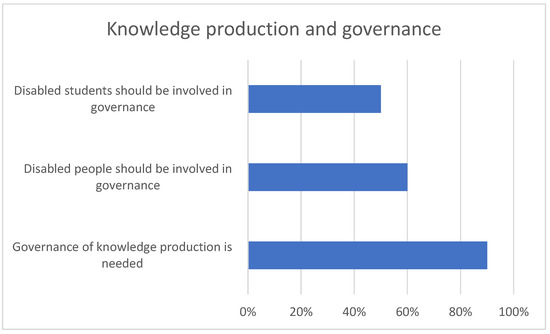 Science knowledge production and knowledge production for science and technology governance is a political and social process [8,9,10,11,12,13,14,29]. Knowledge governance concerns itself with the impact of knowledge production and dissemination to achieve policy and societal change [30] and the interaction “between scientific and citizen groups [is seen] to be a crucial element of the modern ways of knowledge production and governance” [31] (p. 1). Disabled people are often at the receiving end of narratives on how to advance science and technology, such as neurotechnology, robotics, and artificial intelligence. However, problems with the coverage are noted namely a medical imagery bias of the disabled person, a predominantly techno-optimistic narrative, and a low level of engagement with science and technology causing potential social problems for disabled people [32,33,34,35,36,37]. Role theory suggests that expectations of oneself are influenced by the role expectations of others [38]. Undergraduate disabled students are well positioned to become involved in various roles within knowledge production of the missing data regarding the social situation of disabled people and the social impact of different sciences and technologies on disabled people. The question is whether undergraduate disabled students are seen and do see themselves as having a role in scientific knowledge production and especially knowledge production for science and technology governance?