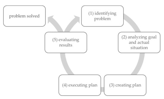 A variety of theories seek to model the process of problem solving, distinguishing different phases [12]. The present paper follows the model of Betsch et al. [15], which is close to the above OECD [16] definition. The model suggests five phases [15,16]: First, the problem must be recognized and identified (phase 1). Second, the actual situation and the goal need to be analyzed (phase 2). After that, it is possible to create a plan for solving the problem (phase 3), and execute the plan and monitor (phase 4). In the last step, the results must be evaluated (phase 5). The evaluation may lead to re-identifying the problem. Figure 1 shows the process of problem solving.