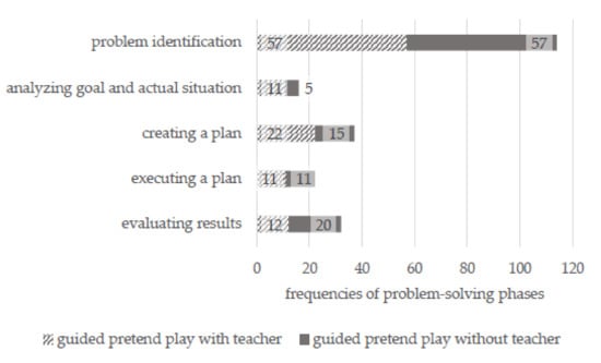 In order to compare the problem-solving processes with or without the teacher being present, quantitative analyses were used. With the help of chi-square test, the frequencies of problem-solving phases and strategies as well as the length of these sequences were tested on the significance between pretend play with or without the teachers’ presence. This follows the mixed methods design of a qualitative-dominated crossover study, whereby quantitative analysis follows dominantly qualitative data collection and analysis [57].