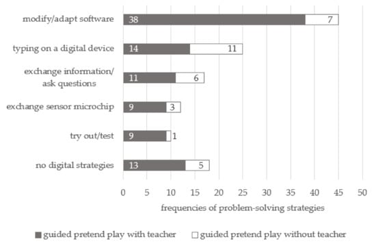 Children used different strategies during the problem-solving sequences. In total, 122 problem-solving strategies were coded during the 75 problem-solving situations. A total of 94 of these 122 problem-solving strategies were coded during guided pretend play with the teacher. Most of the problem-solving strategies were digital strategies (n = 104). A strategy was coded as “no digital strategy” when the problem-solving strategy involved actions such as turning off the device, recharging, or using a screwdriver.