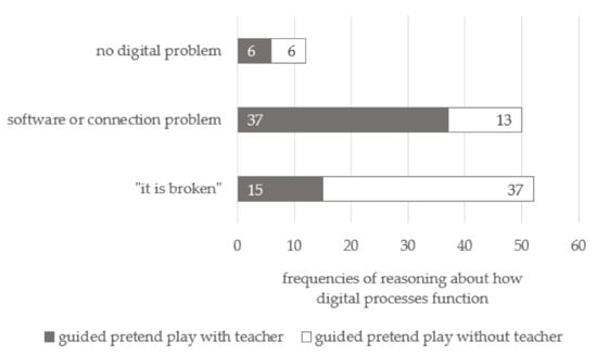The reasoning about how digital processes function is depicted in Figure 4. The results indicate that children significantly more often provided reasoning on how digital processes function with the kindergarten teacher present than without the teacher present (χ2 = 22.72, df = 2; p < 0.001). A total of 52 occurrences involved just “it is broken” without any special explanation. Only in n = 15 of these situations did children identify such an unspecific problem during guided pretend play with the teacher. By comparison, children identified a software or connection problem (e.g., a wrong setting, error message, or connection issue) in n = 50 situations in total, and within these situations, n = 37 were guided by the kindergarten teacher. Children identified no digital problem (e.g., a screw is loose or lightning hit the rocket) n = 12 times, and in half of those (n = 6) the teacher was present.
