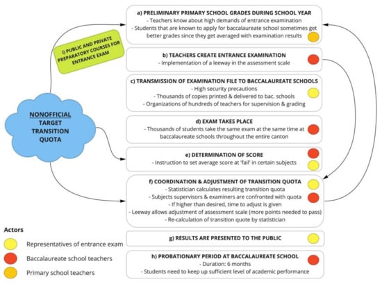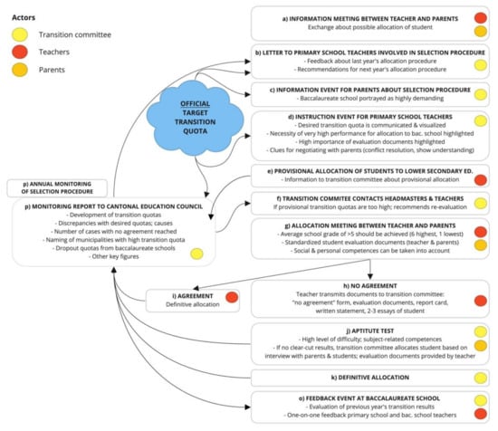 Figure 1 illustrates the selection procedure of Canton A, which consists of many interlinked situations that are not merely linear but trans-sequential [67]. The transition chain is activated by various actors, mainly members of the transition committee, teachers, and parents. Every year, selection is characterized by the challenge of fitting the large number of aspiring students to the maximum transition quota desired by educational policymakers. The actors tackle this challenge with the following strategies, instruments, and procedures.