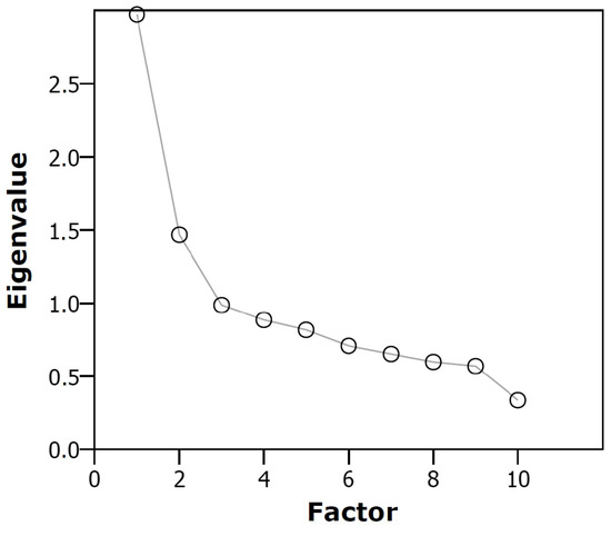 Scree plot corresponding to our exploratory factor analysis. Two factors have eigenvalues greater than 1. Hence, according to the Kaiser citerion [48], two factors are retained.