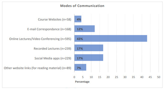 Instructors can use a variety of communication modes in an online setting based on different factors. These tools could be synchronous or asynchronous [62]. In a well-structured course with effective course content and an appropriate communication plan, online courses could be as effective as face-to-face courses [19]. It has been suggested that dividing the students’ learning experiences into an offline self-learning phase and an online teaching phase could enhance their overall learning experience [60]. Abramenka [62] reported that students preferred using e-mail and other asynchronous communication tools for interaction between them and their instructors. Although educational institutes and instructors were largely unprepared for the massive shift from traditional to online modes of teaching, instructors/institutes tried to use different modes of communication and assessment methods to facilitate students’ learning experiences [8,63,64].