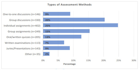 The respondents were also asked to indicate the types of assessment used by instructors during the online education phase (see Figure 2). Amongst the seven assessment types, the majority of the respondents highlighted that the widely used assessment types were ‘individual assessment’ (25%), followed by ‘group discussions’ (20%), ‘group assignments’ (15%), ‘oral/written quizzes’ (13%), ‘juries or presentations and one-to-one discussions (9%), ‘written examinations’ (7%), and ‘other’ (2%). Surprisingly, the ‘written examination’ was the least used assessment method at the time of the study.