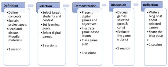 This four-week research was based on a mixed method. Quantitative and qualitative data were gathered through the use of a pre/post-test survey, game demonstrations, class discussion, and students’ reflections in the form of blog posts. The project covered five stages corresponding to different critical thinking skills included in education studies []: defining, selecting, demonstrating, discussing, and reflecting, as shown in Figure 1. Each thinking skill was associated with several academic abilities: stating the problem and becoming familiar with the current situation in DGBL (defining); carefully choosing the most suitable game among different choices on the basis of certain criteria (selecting); explaining and illustrating the games selected through practical examples (demonstrating); debating and evaluating the affordances and limitations of each game with peers (discussing); and considering the learning gains from a critical perspective and expressing the ideas in blog posts (reflecting). For this purpose, students were randomly arranged in teams of 4–5 members in order to find, play, analyze, and select digital games that could be used to teach English to children. The project took place in 8 two-hour class sessions during four weeks.