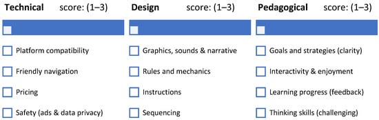 Rubric used for assessment of digital games (1 = basic, 2 = medium, 3 = high).