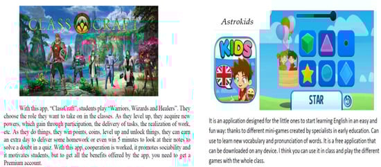 Qualitative data obtained from the blog posts were analyzed and coded according to different patterns in three main themes. The first theme was related with the technical description and reasons to select each game. The three most repeated arguments were visual design, clear instructions, and pricing, which were part of the rubric, and they had been analyzed in previous research as predictors of game preference []. However, teacher candidates did not consider safety (data protection, ads, etc.) as a key element, despite the fact that they were selecting games addressed to children.