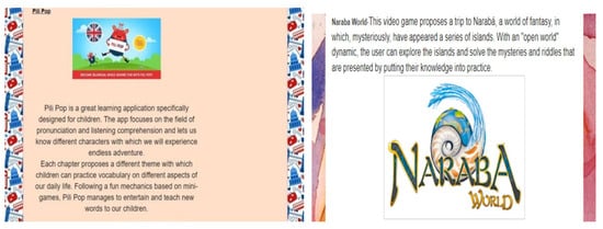 Next, the teams had to explain and illustrate the use of the games they selected, specifying the context (educational level and target students) and goals (language skills and components) to their peers, who had in turn a limited time to play some of these games in the classroom. For this purpose, each team had to prepare a visual presentation which was later shared in the learning module (Moodle) containing relevant information about the game, some images explaining the details included in the rubric and a link to the website so that the classmates could check out, and play whenever possible, the games in and after class. Two examples of presentations are shown in Figure 3.