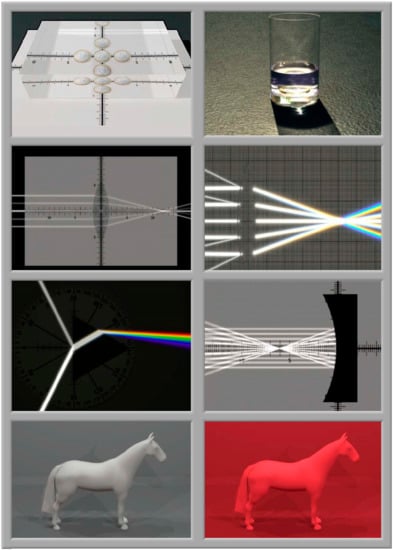 - Naranjo, F.L.; Martínez, G.; Pérez, Á.L.; Pardo, P.J.; Suero, M.I. Teaching rainbows with simulations: Revisiting Minnaert’s lab experiment. Appl. Opt. 2017, 56, G54–G69. [Google Scholar]