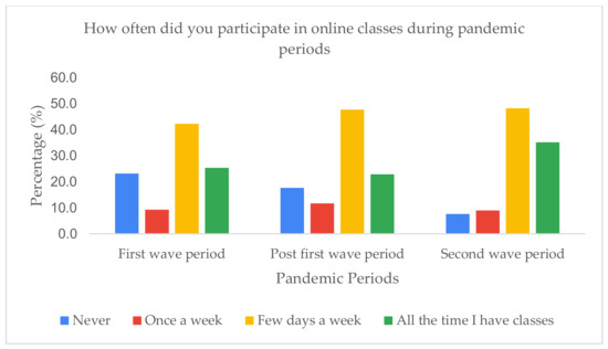Figure 2 shows the pattern of change in attendance to online classes during the pandemic periods. It seems that students’ engagement in online classes had been improved over time. Accordingly, during the first wave period, 25.3% participated in online classes for all the classes, while 23.2% of students never participated in online classes. The percentage of students who have never participated in an online class was reduced over time to 17.7% in the post-first wave period and 7.6% in the second wave period from 23.2% in the first wave period.