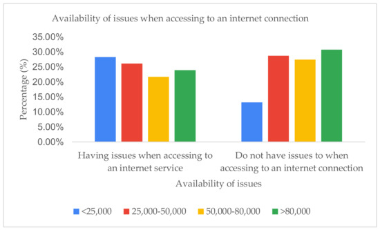 According to [24], the financial difficulties among students created a lack of access to the internet in Sri Lanka. Figure 5 shows percentage distribution by the cross-tabulation results with the family income level and availability of issues when accessing an internet connection. The results show that the Pearson chi-square value is 0.018, which is less than 0.05, implying accepting the alternative hypothesis, there is a statistically significant relationship between access to an internet connection at a 5% level. The quantitative data depicts that, among the students who were unable to purchase an internet package, more than 50% of their monthly income is below LKR 50,000. Further, more than 50% of their family income has been affected negatively by the pandemic; either their income reduced or stopped due to the pandemic. This implies that lower economic levels are severely impacted by the pandemic and make it difficult for students to engage in online education compared to face-to-face classes.