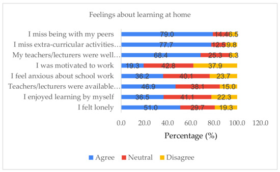 Both positive and negative feelings are reported in the literature when studying remotely [40,41]. Loneliness, anxiety, and lack of motivation are predominant in many findings when studying remotely. Figure 6 shows the proportion of students who agree, disagree or are neutral for the statements about their feelings when learning at home.