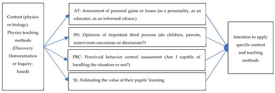 Therefore, the research questions are as follows: Do the teachers’ intentions differ when they opt in favor of physics or biology content in their classrooms? Do the teachers’ intentions differ when they choose between the discovery demonstration and the inquiry-based learning methods to teach physics content? To what extent do these differences depend on the teachers’ assessments of their personal gains or losses (AT), on the positive or negative opinions of important third persons (SN), on the assessments of their perceived ability to control (PBC) the teaching process, and on their assessments of how much meaningful knowledge the children eventually learn (SL). These questions are schematically represented in Figure 1.