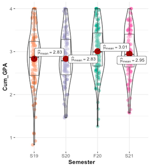 As the results show, there are no significant differences between all modes, i.e., at the significant level of 5 percent, and when we compare all teaching modes together (the academic performance of four cohorts of students in each cumulative GPA subgroup), none of them are significant. So, none of the teaching modes are more effective than the others. On the other hand, when we compare the output of the graphical tests illustrated in Figure 3, it seems that for some cohorts, the statistical test results can be different if we employ pairwise comparisons (Mann–Whitney U test).